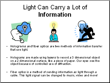 Holograms are made using lasers to record a 3 dimensional object on a 2 dimensional surface, like a piece of paper. Our eyes see the object because of controlled use of diffraction.