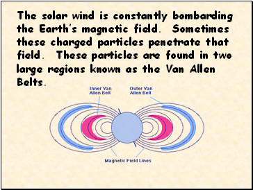The solar wind is constantly bombarding the Earth’s magnetic field. Sometimes these charged particles penetrate that field. These particles are found in two large regions known as the Van Allen Belts.