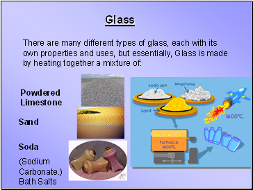 There are many different types of glass, each with its own properties and uses, but essentially, Glass is made by heating together a mixture of: