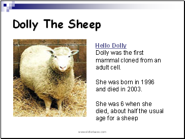 Hello Dolly Dolly was the first mammal cloned from an adult cell.