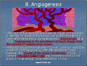 Often during the development of earlier stages of the tumour, or perhaps by the time the tumour has broken through the basement membrane (as pictured above), angiogenesis takes place. Angiogenesis is the recruitment of blood vessels from the network of neighbouring vessels.