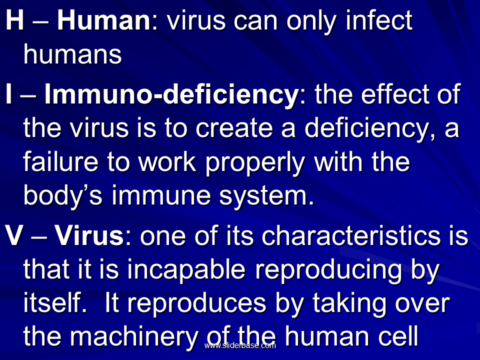 I Immuno-deficiency: the effect of the virus is to create a deficiency, a failure to work properly with the bodys immune system.