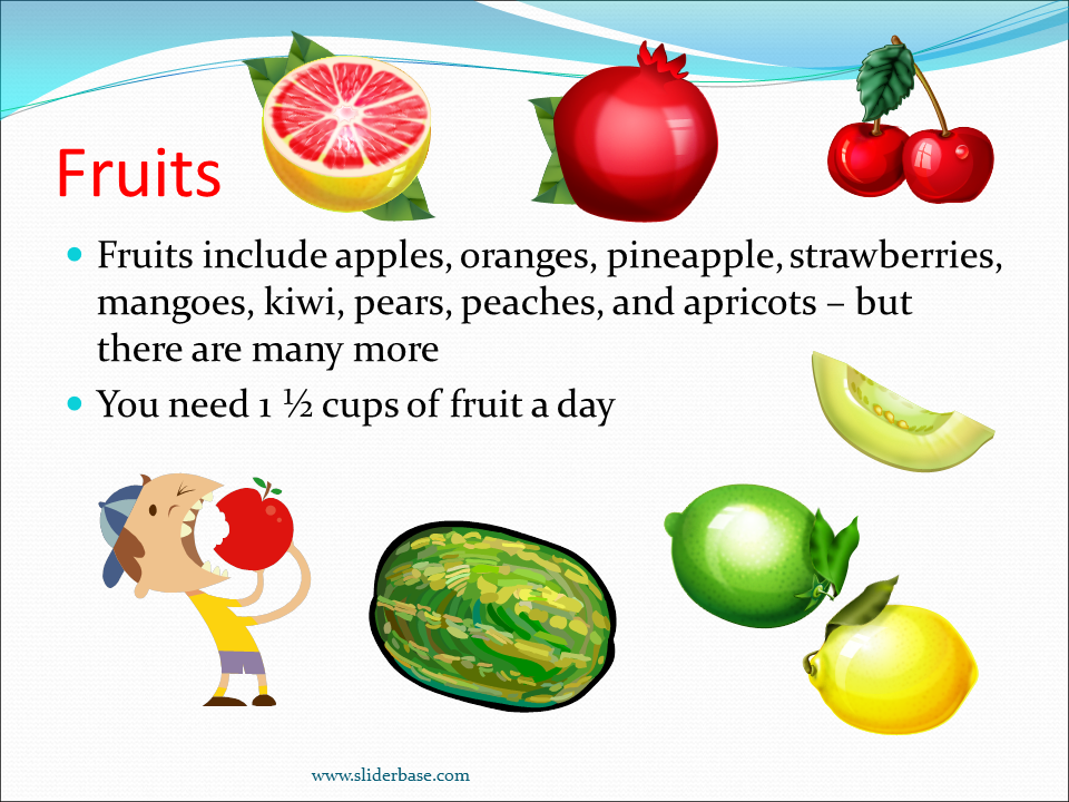 Fruits include apples, oranges, pineapple, strawberries, mangoes, kiwi, pears, peaches, and apricots – but there are many more
